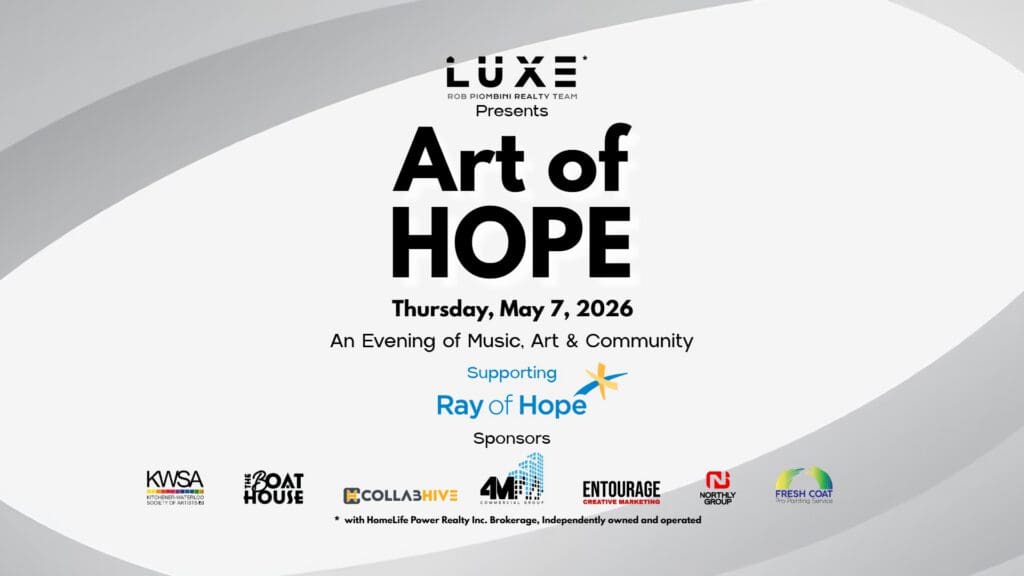 Luxe Realty Team presents Art of Hope. Join us for an intimate evening featuring a live jazz performance by Jontue Elan, local art exhibition featuring art by the Kitchener-Waterloo Society of Artists, food and drinks, and a community coming together to support Ray of Hope.